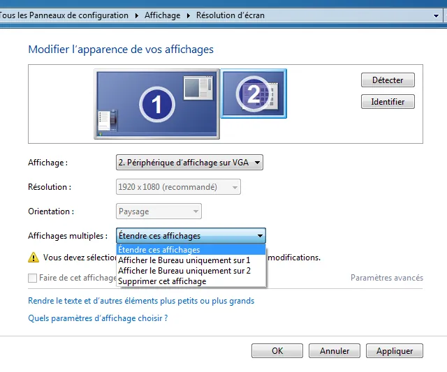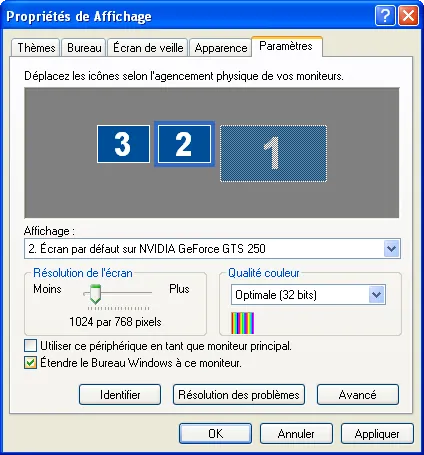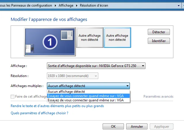 Click on “Detect” to make extra display appear and select the one that is associated to the GTS 250. On Multiple displays select Try to connect anyway on VGA. Click on Apply.